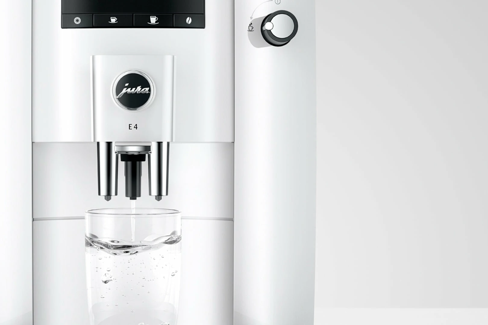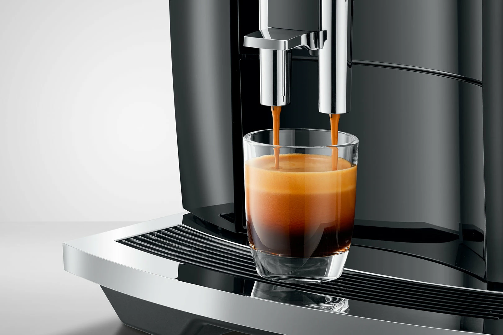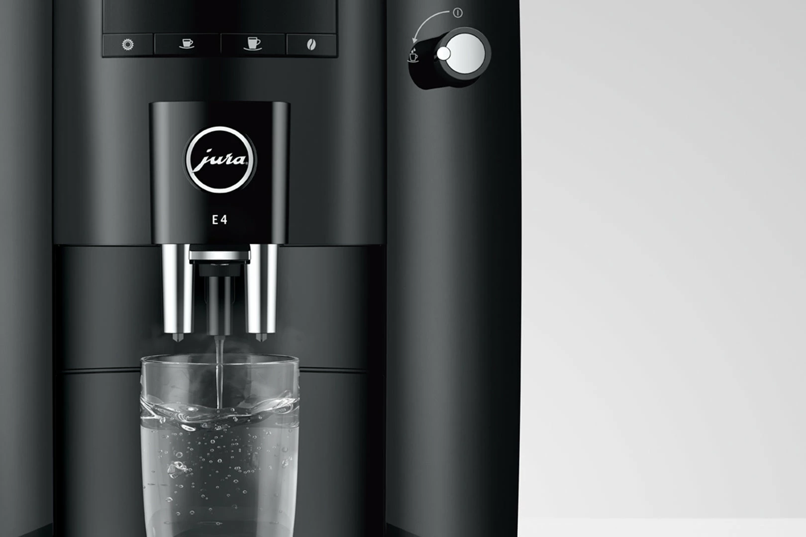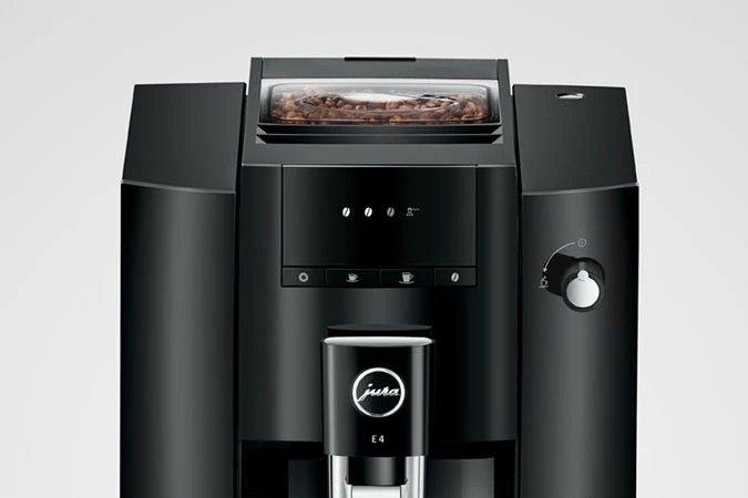 The E4 reflects the characteristic design of JURA coffee machines, with clean lines and surfaces. Crafted with maximum precision, the minimalist lines emphasise the premium quality of the machine. The use of colours follows the same minimalist approach. While the complete body of the machine is in understated Piano Black, chrome-plated details add accents and set off the finished coffee to perfection.